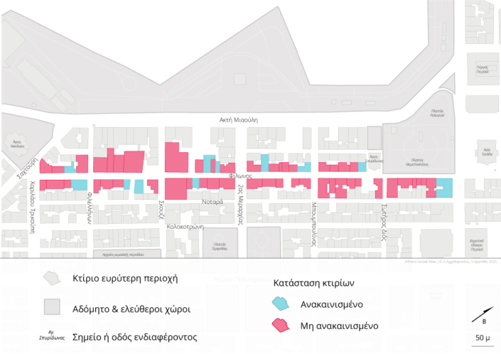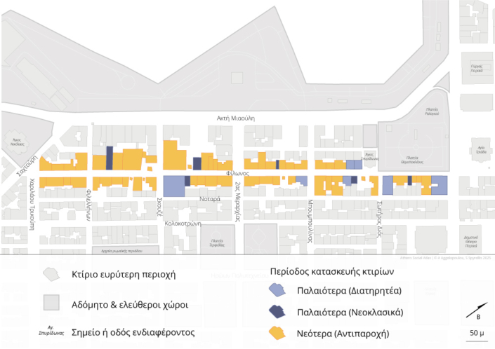 Η διαφοροποίηση ανάμεσα στην αριστερή και την δεξιά πλευρά της οδού αποτυπώνεται έντονα και στο κτιριακό απόθεμα, με την δευτερη να συγκεντρώνει σημαντικό αριθμό παλαιότερων αλλά και μερικών διατηρητέων κτιρίων [6] (χάρτης 6), τα οποία σε μεγάλο βαθμό έχουν εγκαταλειφθεί. Η εγκατάλειψη αυτή συχνά οφείλεται στο γεγονός ότι η αποκατάσταση και η αξιοποίησή τους συνιστούν μια ιδιαίτερα δαπανηρή διαδικασία, εφικτή μόνο για ιδιοκτήτες με ισχυρά οικονομικά μέσα (Kritikos, 2023). Στην περίπτωση της Τρούμπας, φαίνεται το υψηλό κόστος συντήρησης να συγκρούεται με την κοινωνική και οικονομική πραγματικότητα των ιδιοκτητών της περιοχής, καθιστώντας την ιδιοκτησία τους βάρος.