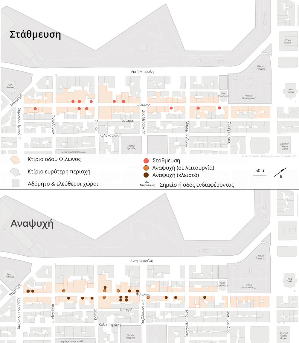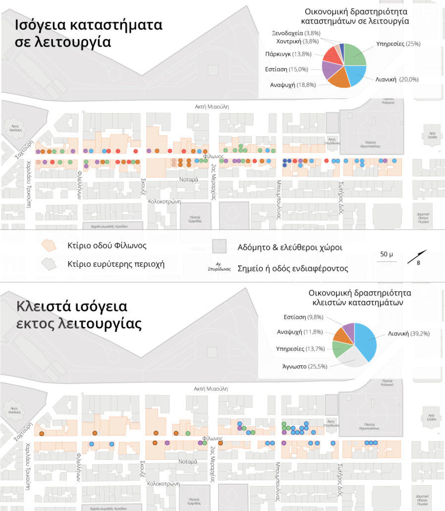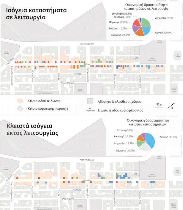 Χάρτες 4 & 5: Κατανομή ισόγειων καταστημάτων, σε λειτουργία και εκτός λειτουργίας, ανάλογα με την δραστηριότητα τους στην οδό Φίλωνος
