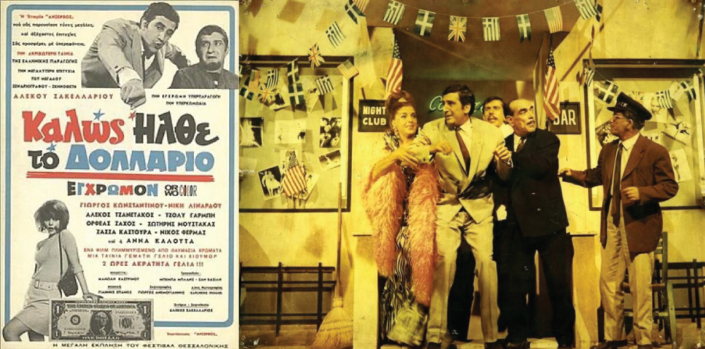 Εικόνες 8 & 9: Αφίσα και στιγμιότυπο της ταινίας “Καλώς ήλθε το δολλάριο”, του Αλέκου Σακελλάριου, 1967.