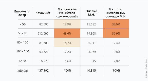 Τέλος, φαίνεται ότι τα ακίνητα που είναι πραγματικά εκτός χρήσης έχουν σε μεγαλύτερο ποσοστό μέγεθος κάτω από 50 τμ σε σχέση με την κατανομή της ΕΛΣΤΑΤ, επιβεβαιώνοντας την υπόθεση ότι πρόκειται μάλλον για απαξιωμένα ακίνητα σε υπόγεια και χαμηλούς ορόφους.