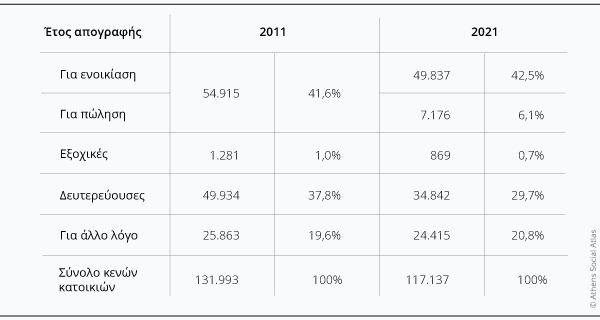 [4] Ο πολύ μεγάλος αριθμός κενών προς ενοικίαση δεν αντιστοιχεί με την προσφορά κατοικιών που εμφανίζεται στις πλατφόρμες αγγελιών (π.χ. στις 17/12/2025 εμφανίζονται στον spitogato.gr 7.591 και στο indomio.gr 8.355 κατοικίες προς μίσθωση). Παρά την χρονική απόσταση από την απογραφή, αυτό δημιουργεί ερωτήματα ως προς τις περιπτώσεις ακινήτων που εντάσσονται σε αυτή την κατηγορία. Πιθανά σε αυτή έχουν καταγραφεί εκ παραδρομής βραχυχρόνιες μισθώσεις που σύμφωνα με την ΕΛΣΤΑΤ τυπικά εμπίπτουν στις εξοχικές κατοικίες. Αυτή η υπόθεση υποστηρίζεται και από τον πολύ χαμηλό αριθμό εξοχικών κατοικιών που καταγράφηκαν το 2021.