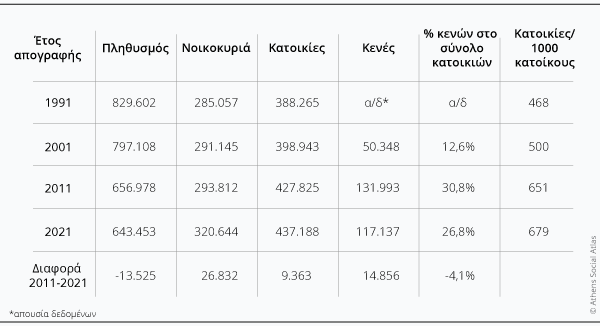 Συνολικά την περίοδο 1991-2021 η Αθήνα παρουσιάζει έντονη δημογραφική συρρίκνωση (ιδιαίτερα την δεκαετία 2001-2011) σε συνδυασμό με αύξηση των νοικοκυριών, αλλά και του αποθέματος κατοικιών (ιδιαίτερα την περίοδο 2001-2011) (Πίνακας 2). Οι κενές κατοικίες κορυφώνονται το 2011 και μειώνονται την δεκαετία 2011-2021, παραμένοντας σε υψηλά επίπεδα [6].
