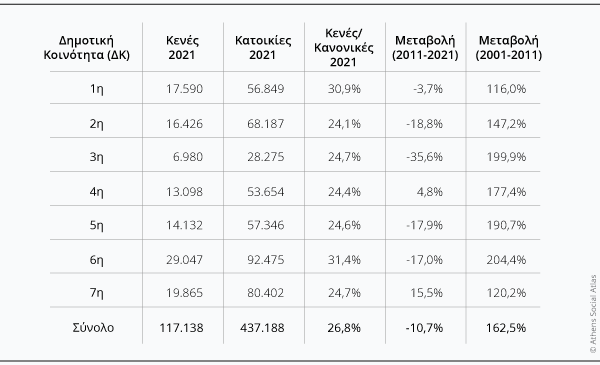 Ως προς την χωρική κατανομή στις επτά δημοτικές κοινότητες (Πίνακας 3, Γράφημα 1) η 6η Δ.Κ. (Πατήσια, Κυψέλη) συγκεντρώνει το 2021 τον μεγαλύτερο αριθμό κενών κατοικιών (σε απόλυτες και σχετικές τιμές), γεγονός που σχετίζεται με το εκτεταμένο οικιστικό απόθεμα και την σημαντική αύξηση κενών που κατέγραψε την προηγούμενη δεκαετία. Υψηλές συγκεντρώσεις παρατηρούνται επίσης στην 7η (Αμπελόκηποι, Πολύγωνο) και 2η (Παγκράτι, Νέος Κόσμος) κοινότητα, ενώ στην 1η (Κέντρο, Κολωνάκι, Εξάρχεια, Κουκάκι) το υψηλό ποσοστό κενών σχετίζεται και με την μεγάλη παρουσία εμπορικών και επαγγελματικών χρήσεων.