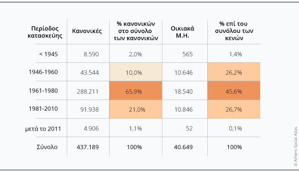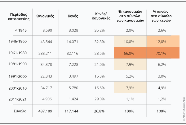 Η παλαιότητα των κενών κατοικιών αποτελεί κρίσιμο παράγοντα, καθώς σχετίζεται με το υψηλό κόστος αποκατάστασης και ενεργειακής αναβάθμισης που πιθανά απαιτείται για την επανάχρησή τους. Το 82% των κενών διαμερισμάτων εντοπίζεται σε κτίρια της περιόδου 1946-1980, ιδίως στη φάση της μαζικής παραγωγής πολυκατοικιών της αντιπαροχής (1960-1980) (Πίνακας 4). Περαιτέρω διερεύνηση απαιτεί και το μεγάλο ποσοστό κενών στις νεότερες κατασκευές. Αν και η παραγωγή νέων κατοικιών -όπως αποτυπώνεται στην απογραφή- είναι σχετικά χαμηλή σε σχέση με τη ζήτηση, παρόλα αυτά μεγάλο μέρος του νέου αποθέματος δεν μπαίνει σε χρήση. Πιθανά αυτό σχετίζεται είτε με τις πολύ υψηλές πώλησης και ενοικίασης των νεόδμητων κατοικιών, είτε με το είδος των αγοραστών αυτού του αποθέματος που ενδεχομένως έχουν επενδυτικά κίνητρα (π.χ. golden visa).