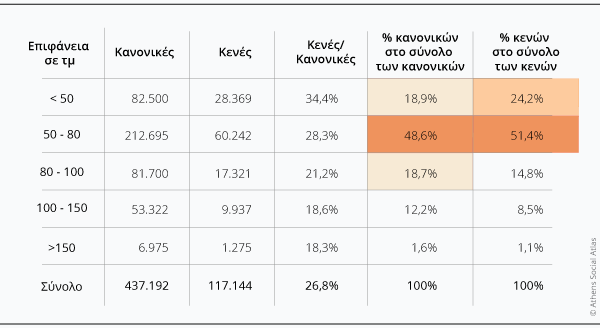 Όσον αφορά το μέγεθος των κενών κατοικιών, οι μισές κυμαίνονται μεταξύ 50 και 80 τμ, κατ’ αναλογία με το συνολικό οικιστικό απόθεμα, ενώ σημαντικό ποσοστό εντοπίζεται και σε κατοικίες κάτω από 50τμ. Η κατηγορία αυτή ενδέχεται να αντιστοιχεί σε συγκριτικά πιο απαξιωμένο τμήμα του οικιστικού αποθέματος, δεδομένου ότι στο τυπικό πρότυπο της πολυκατοικίας της αντιπαροχής που κυριαρχεί στον Δήμο Αθηναίων οι μικρότερες κατοικίες χωροθετούνται κατά κανόνα στους χαμηλότερους ορόφους, οι οποίοι έχουν συνδεθεί με χαμηλότερη αξία και ποιότητα κατοίκησης (βλ. Γράφημα 1, Μαλούτας & Σπυρέλλης, 2015).