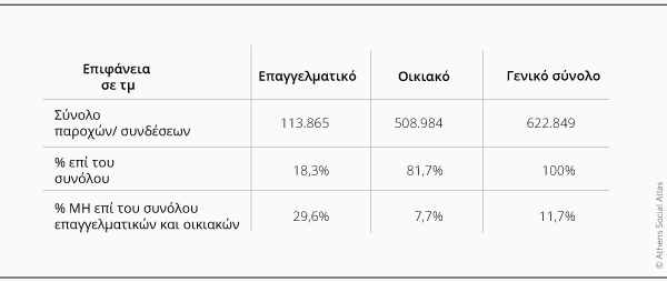 Η βάση δεδομένων του ΔΕΔΔΗΕ παρέχει πληροφορίες για τα ακίνητα που παραμένουν εκτός ηλεκτρικής σύνδεσης κατά την ημερομηνία εξαγωγής των δεδομένων [7]. Στη συνέχεια αναλύονται οι συγκεντρώσεις και η χωρική κατανομή των Μ.Η. στον Δήμο Αθηναίων ανά χρήση (πρώην οικιστική ή επαγγελματική), οι χρονικότητες των ηλεκτροδιακοπών, καθώς και το μέγεθος και η ηλικία των Μ.Η. ακινήτων. Με βάση τα στοιχεία του Σεπτεμβρίου 2025 (Πίνακας 6) στον Δήμο Αθηναίων καταγράφονται συνολικά 622.849 ηλεκτρικές παροχές, από τις οποίες το 81,7% είναι οικιακές και το 18,3% επαγγελματικές [8]. Από αυτές το 11,7% ήταν εκτός σύνδεσης. Το ποσοστο των Μ.Η. είναι πολύ υψηλότερο για τις επαγγελματικές με σχεδόν ένα στα τρια ακίνητα να είναι μη ηλεκτροδοτούμενο, ενώ είναι 7,7% για τις οικιακές, σε σημαντική απόκλιση από το 26,8% κενών κατοικιών που κατέγραψε η ΕΛΣΤΑΤ το 2021.