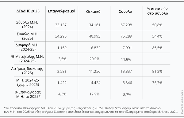 [9] Το πρώτο εννεάμηνο του 2025 καταγράφηκαν 11.256 αιτήσεις ηλεκτροδιακοπής οικιακών ακινήτων, αυξημένες κατά 120% από τις αιτήσεις ηλεκτροδιακοπής του 2024 που ήταν 5.115. Στις αναλύσεις που ακολουθούν έχουν αφαιρεθεί οι διακοπές του 2025.