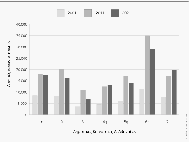 Η μεγάλη μεταβολή στην 3η κοινότητα (Πετράλωνα, Θησείο, Βοτανικός, Γκάζι) εξηγείται πιθανά από το μικρό συγκριτικά μέγεθος του οικιστικού αποθέματος, αλλά και την εγκατάλειψη και υποεπένδυση στην περιοχή την προηγούμενη δεκαετία εν αναμονή πιο κερδοφόρων δυναμικών αναβάθμισης, αλλά και λόγω της εκτεταμένης ανάπτυξης χρήσεων αναψυχής και τουρισμού. Η 2η και 6η κοινότητα βρίσκονται στο επίκεντρο των τάσεων εξευγενισμού και τουριστικοποίησης των κεντρικών γειτονιών, ενώ η μείωση των κενών στην 5η κοινότητα (Άνω Πατήσια, Ριζούπολη) μπορεί να οφείλεται στον εκτοπισμό κατοίκων από τις κεντρικές περιοχές. Στην 1η κοινότητα, παρά την μεγάλη συγκέντρωση τουριστικών καταλυμάτων και επενδύσεων, η μικρή μεταβολή πιθανά αντανακλά τη μετατόπιση κατοικιών από εκτός χρήσης κενά σε βραχυχρονια μίσθωση. Σίγουρα, η διατύπωση ασφαλέστερων συμπερασμάτων προϋποθέτει περαιτέρω επιτόπια και εις βάθος έρευνα.
