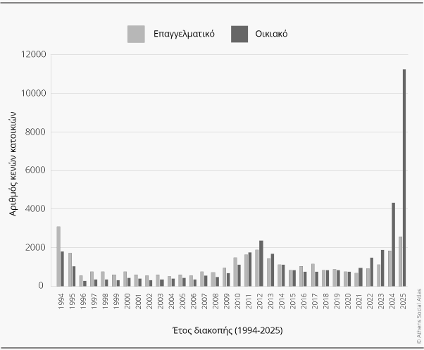 [8] Οι οικιακές παροχές το 2025 (508.984) υπερβαίνουν σημαντικά τον αριθμό των κανονικών κατοικιών που κατέγραψε η ΕΛΣΤΑΤ το 2021 (437.188), με διαφορά 71.792 μονάδων. Οι λόγοι αυτής της απόκλισης δεν είναι απολύτως σαφείς: παροχές δηλωμένες ως οικιακές ενδέχεται να μην αντιστοιχούν σε χρήση κατοικίας και συνεπώς να μην καταγράφονται στην απογραφή, ενώ ορισμένες κατοικίες μπορεί να διαθέτουν περισσότερες από μία οικιακές παροχές. Η ερμηνεία της διαφοράς απαιτεί περαιτέρω διερεύνηση. Στις αναλύσεις που ακολουθούν, τα στοιχεία της ΕΛΣΤΑΤ χρησιμοποιούνται ως βάση αναφοράς για το οικιστικό απόθεμα.