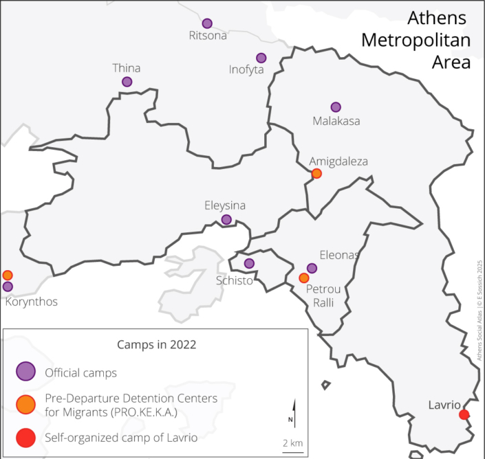 From the summer of 2015 until the fall of 2022, Eleonas camp[1] was one of the main Athenian reception facilities, embodying many of the transformations which have characterized the evolution of the governance of the “refugee issue” in Greece during the last decade. As such transformations concerned changes in the role of the central and local government, international organisations and civil society, it is argued that an analysis of the Eleonas camp trajectory, concluded in 2022 through a complex eviction and the “regeneration” of the site, shows a convergence of urban and migration governance, a convergence which appears to be a distinctive trait of the Greek “Multilevel Governance” of migration.