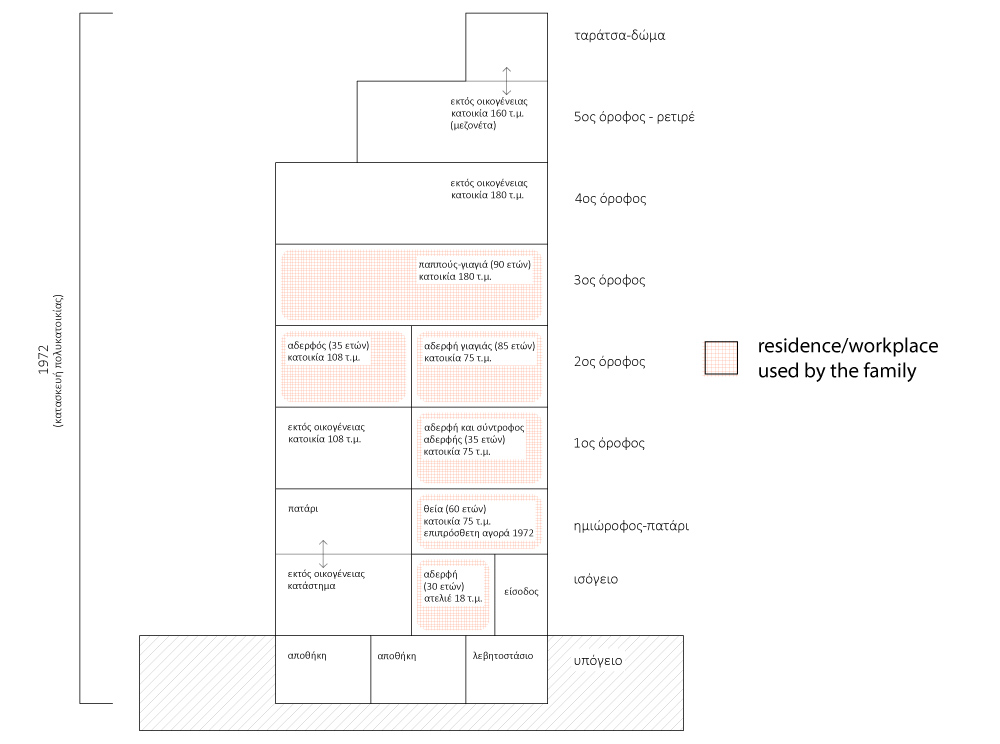 Figure 4: Family apartment building through self-promotion in Lycabettus (construction phases, uses and size of apartments, relationship between residents-relatives).
