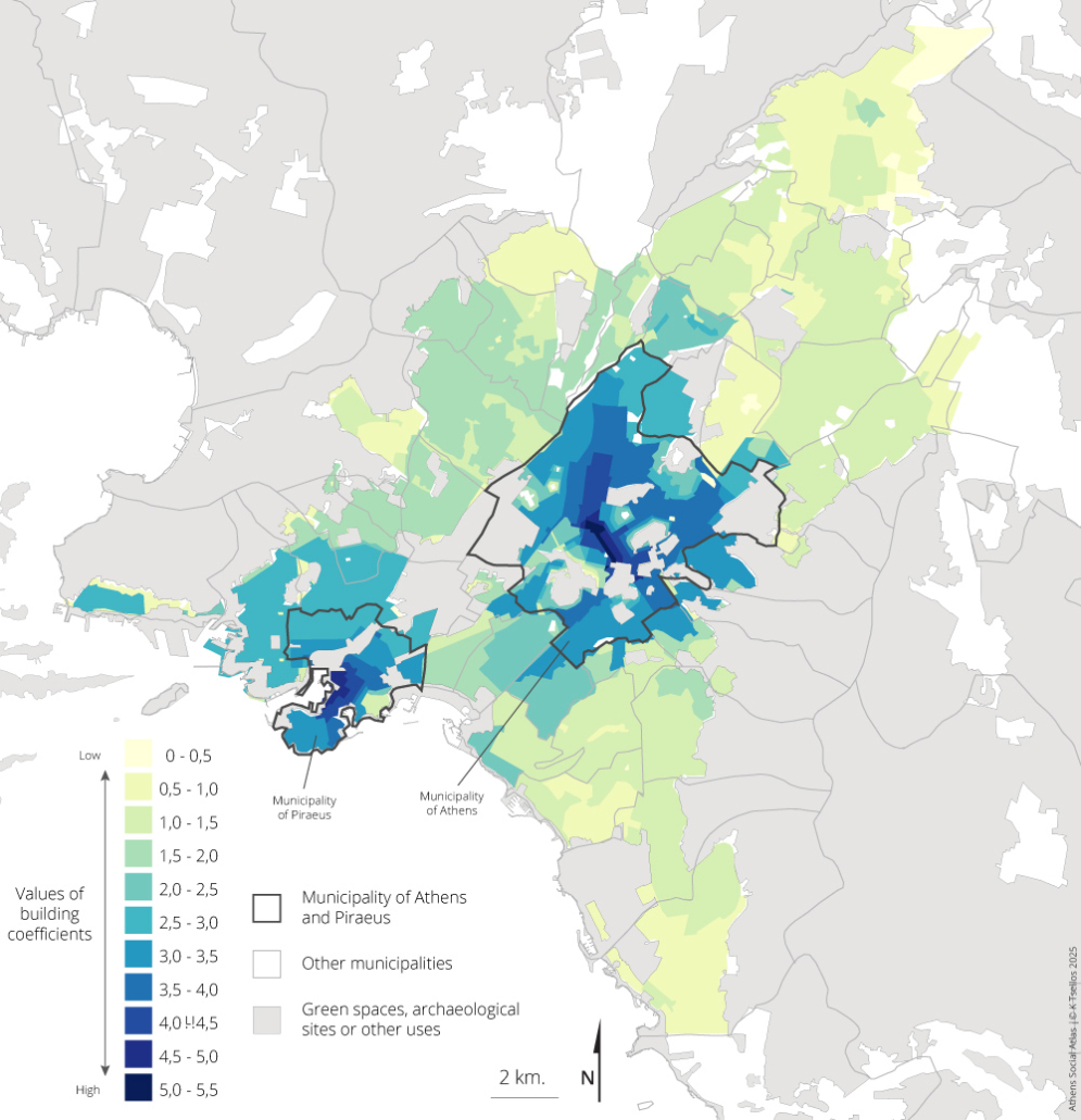 According to map 1, the areas with the highest building coefficients (from 3.5 and above) are located in the municipalities of Athens and Piraeus, but also in the neighbouring municipalities, with coefficients from 2 to 3.5. Low to medium building coefficients (from 1 to 2) correspond to peripheral areas, with a focus on the western suburbs (Agia Varvara, Chaidari, Ilion, Peristeri, Petroupoli, Agioi Anargyroi, Nea Filadelfeia-Chalkidona), where small-sized and low-rise family apartment buildings are concentrated. Similar values can also be found in the northern suburbs (Metamorfosi, Irakleio, Marousi, Chalandri, Agia Paraskevi, and Papagou-Holargos), as well as in the southern (Moschato) and southeastern areas of Athens (Ymittos, Agios Dimitrios, Ilioupoli, Elliniko-Argyroupoli). Finally, the lowest building coefficients (up to 1) are found in the most sparsely populated suburbs of Athens with scattered single and doublex houses.
